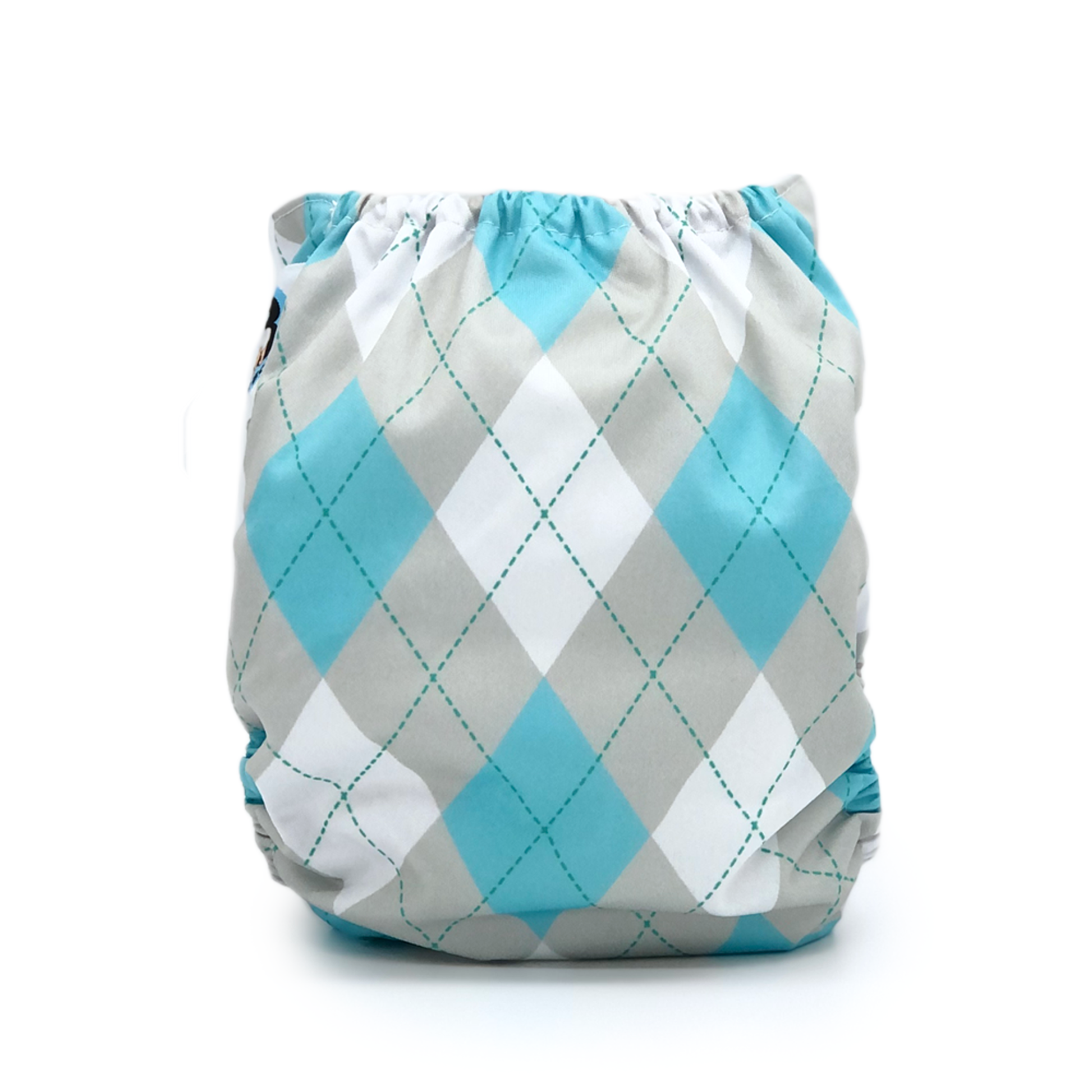We love this preppy, classic argyle cloth diaper in bright whites, aqua blues and calming toasty grey. If Vineyard Vines made cloth diapers, our "Oxford" print would be a contender for the catalog. Microfiber insert included.